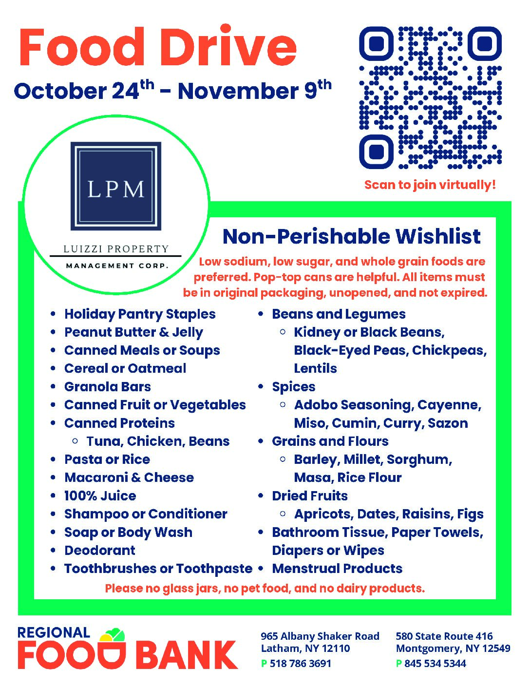 Luizzi Property Management is proud to partner with the Regional Food Bank for our annual Food & Fund Drive! Join us in supporting local families this season by donating non-perishable food items or contributing online. Every item and dollar makes a difference!